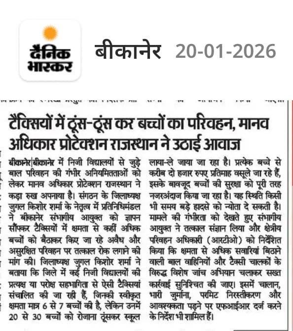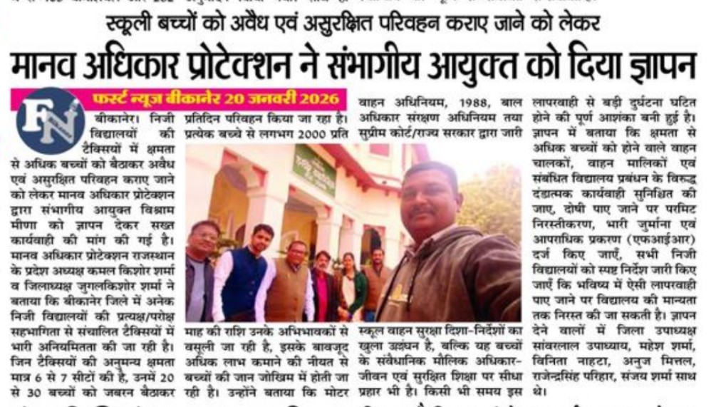 मानव अधिकार प्रोटेक्शन राजस्थान प्रदेश अध्यक्ष के नेत्रत्व में स्कूल में पढ़ने वाले बच्चों की ज़िंदगीयौ से खिलवाड़ कर रहे टेक्सी वाहनों के खिलाफ मंडलायुक्त बीकानेर विश्राम मीणा जी को सौंप ज्ञापन