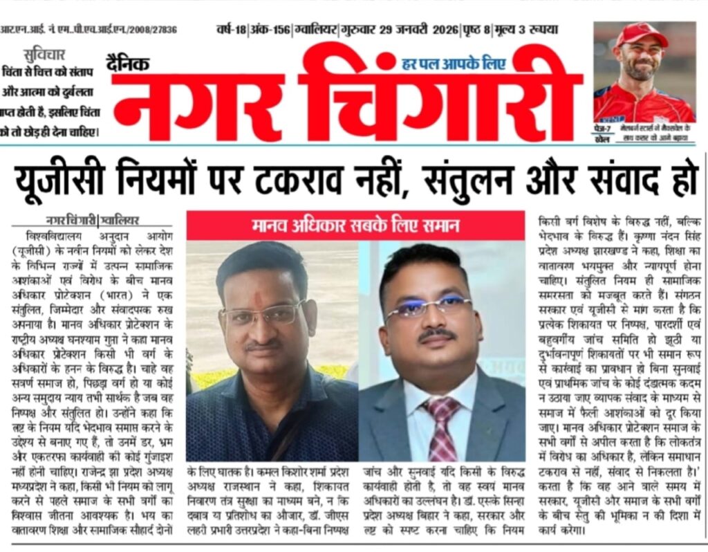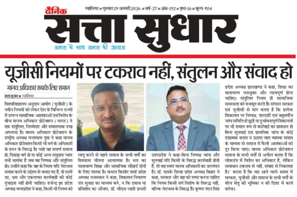 विश्वविद्यालय अनुदान आयोग (UGC) के नवीन नियमों को लेकर देश के विभिन्न राज्यों में उत्पन्न सामाजिक आशंकाओं एवं विरोध के बीच मानव अधिकार प्रोटेक्शन (भारत) ने एक संतुलित, जिम्मेदार और संवादपरक रुख अपनाया है। मानव अधिकार प्रोटेक्शन के राष्ट्रीय अध्यक्ष घनश्याम गुप्ता ने कहा मानव अधिकार प्रोटेक्शन किसी भी वर्ग के अधिकारों के हनन के विरुद्ध है। चाहे वह सवर्ण समाज हो, पिछड़ा वर्ग हो या कोई अन्य समुदाय न्याय तभी सार्थक है जब वह निष्पक्ष और संतुलित हो। उन्होंने कहा कि UGC के नियम यदि भेदभाव समाप्त करने के उद्देश्य से बनाए गए हैं, तो उनमें डर, भ्रम और एकतरफा कार्यवाही की कोई गुंजाइश नहीं होनी चाहिए। राजेन्द्र झा (प्रदेश अध्यक्ष, मध्यप्रदेश) ने कहा— किसी भी नियम को लागू करने से पहले समाज के सभी वर्गों का विश्वास जीतना आवश्यक है। भय का वातावरण शिक्षा और सामाजिक सौहार्द—दोनों के लिए घातक है। कमल किशोर शर्मा (प्रदेश अध्यक्ष, राजस्थान) ने कहा— शिकायत निवारण तंत्र सुरक्षा का माध्यम बने, न कि दबाव या प्रतिशोध का औजार, डा. जी. एस. लहरी (प्रभारी, उत्तर प्रदेश) ने कहा— बिना निष्पक्ष जांच और सुनवाई यदि किसी के विरुद्ध कार्यवाही होती है, तो वह स्वयं मानव अधिकारों का उल्लंघन है। डा. एस. के. सिन्हा (प्रदेश अध्यक्ष, बिहार) ने कहा— सरकार और UGC को स्पष्ट करना चाहिए कि नियम किसी वर्ग विशेष के विरुद्ध नहीं, बल्कि भेदभाव के विरुद्ध हैं। कृष्णा नंदन सिंह (प्रदेश अध्यक्ष, झारखण्ड) ने कहा—शिक्षा का वातावरण भयमुक्त और न्यायपूर्ण होना चाहिए। संतुलित नियम ही सामाजिक समरसता को मजबूत करते हैं। संगठन सरकार एवं UGC से मांग करता है कि— प्रत्येक शिकायत पर निष्पक्ष, पारदर्शी एवं बहु-वर्गीय जांच समिति हो झूठी या दुर्भावनापूर्ण शिकायतों पर भी समान रूप से कार्यवाही का प्रावधान हो बिना सुनवाई एवं प्राथमिक जांच के कोई दंडात्मक कदम न उठाया जाए व्यापक संवाद के माध्यम से समाज में फैली आशंकाओं को दूर किया जाए । मानव अधिकार प्रोटेक्शन समाज के सभी वर्गों से अपील करता है कि— लोकतंत्र में विरोध का अधिकार है, लेकिन समाधान टकराव से नहीं, संवाद से निकलता है।” संगठन यह भी स्पष्ट करता है कि वह आने वाले समय में सरकार, UGC और समाज के सभी वर्गों के बीच सेतु की भूमिका निभाते हुए समाधान की दिशा में कार्य करेगा।