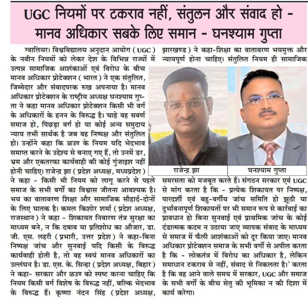 You are currently viewing UGC नियमों पर टकराव नहीं, संतुलन और संवाद हो — मानव अधिकार सबके लिए समान** घनश्याम गुप्ता